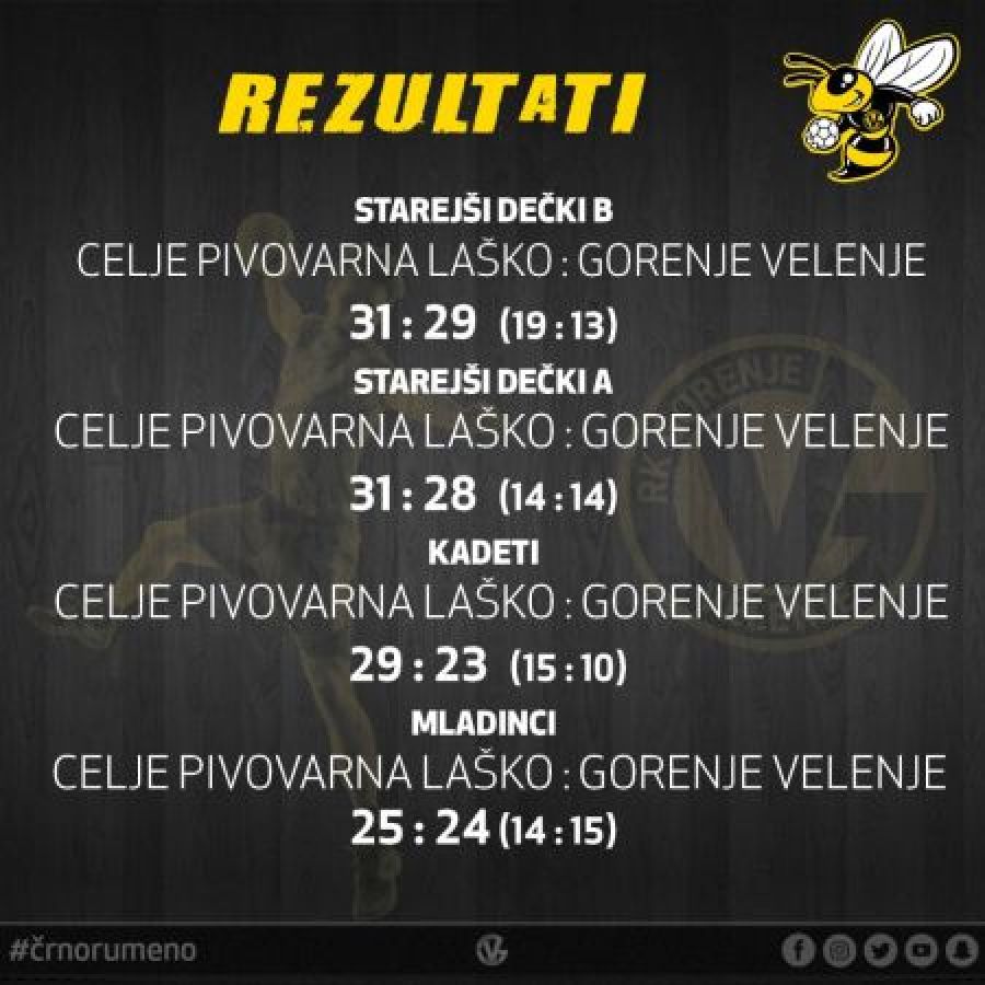 Tekmo v Celju so Velenjčani dobro odprli in si priigrali nekaj zadetkov prednosti. Celjani, ki imajo tudi v letošnji sezoni odlično ekipo, so po slabšem začetku zaigrali bolje in kmalu ujeli priključek. V nadaljevanju sta se obe ekipi izmenjavali v vodstvu in ob polčasu so celjski rokometaši zaostajali za gol (14:15). V drugem polčasu so črno-rumeni nadaljevali z uspešno igro v obrambi, v napadu pa bili v določenih momentih premalo odločni, kar je na koncu odločilo tekmo in zmago prineslo mladinski ekipi Celja (25:24).