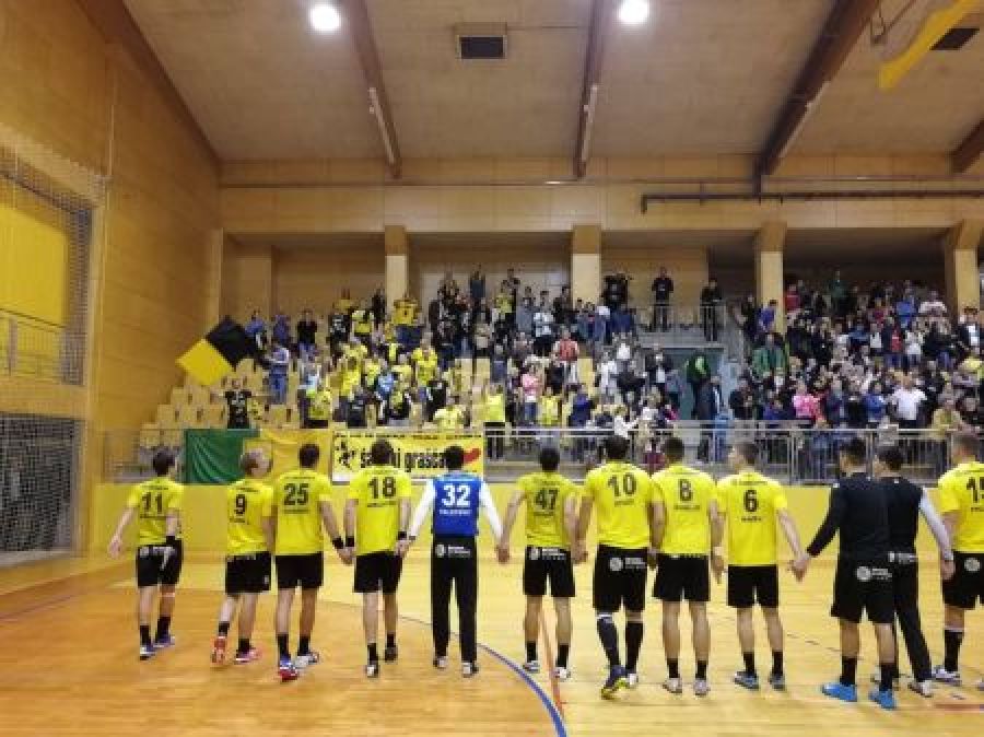 Tekmo sta obe ekipi začeli z veliko mero borbenosti v obrambi. Začetne minute so bile rezultatsko izenačene. Črno-rumenim je možnost za pobeg na več kot zadetek prednosti onemogočala nezbranost v napadu in neizkoriščenost čistih priložnosti v napadu. Prvič so Velenjčani povedli s +2 v 14. minuti, ko je za 6:4 zadel Matic Verdinek. Obramba je delovala odlično, nekaj tehničnih napak pa se je pojavilo v napadu. Prav te so domačim rokometašem pomagale, da so ob koncu prvega dela v 26. minuti povedli s 12:11. Vlado Matanović je postavil rezultat polčasa 14:14.