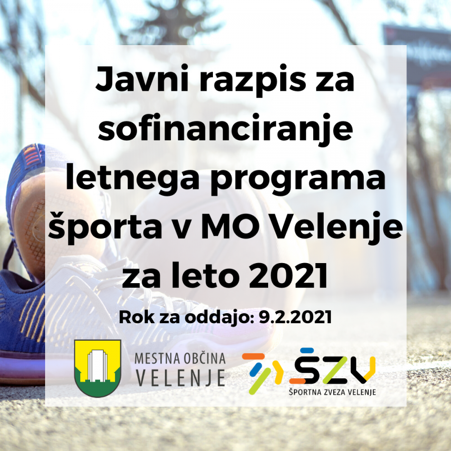 Mestna občina Velenje je 11.1.2021, objavila Javni razpis za sofinanciranje letnega programa športa za leto 2021. Rok za prijavo na razpis je 9.2.2021.