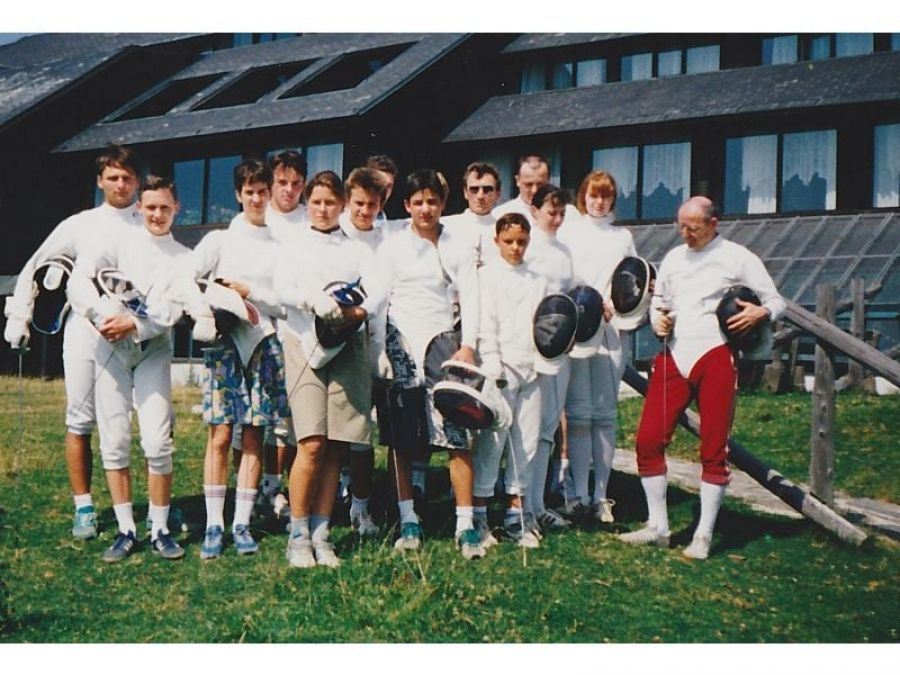 Na sliki so mladi sabljači na pripravah na Rogli leta 1994 s trenerjem in enim od ustanovnih članov kluba, Marijanom Salobirjem.
