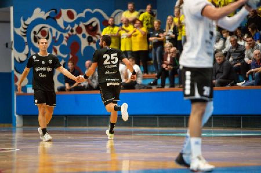 Velenjčani so tekmo dobro odprli in z zadetkom Tilna Sokoliča v tretji minuti povedli s 3:0. Vodstvo črno-rumenih ni trajalo dolgo, saj so domačini hitro rezultat izenačili in po zadetku Roka Cvetka prvič povedli. Izenačen dvoboj se je nadaljeval, borbene Slovenjgradčane pa je v vodstvu držal razpoloženi Gašper Dobaj. V zadnjih minutah prvega polčasa je nekaj ključnih strelov domačih zaustavil Matevž Skok in svojo ekipo popeljal do novega vodstva. Velenjčani so prednost uspeli zadržati in se na odmor odpravili z zadetkom pednosti (14:15).