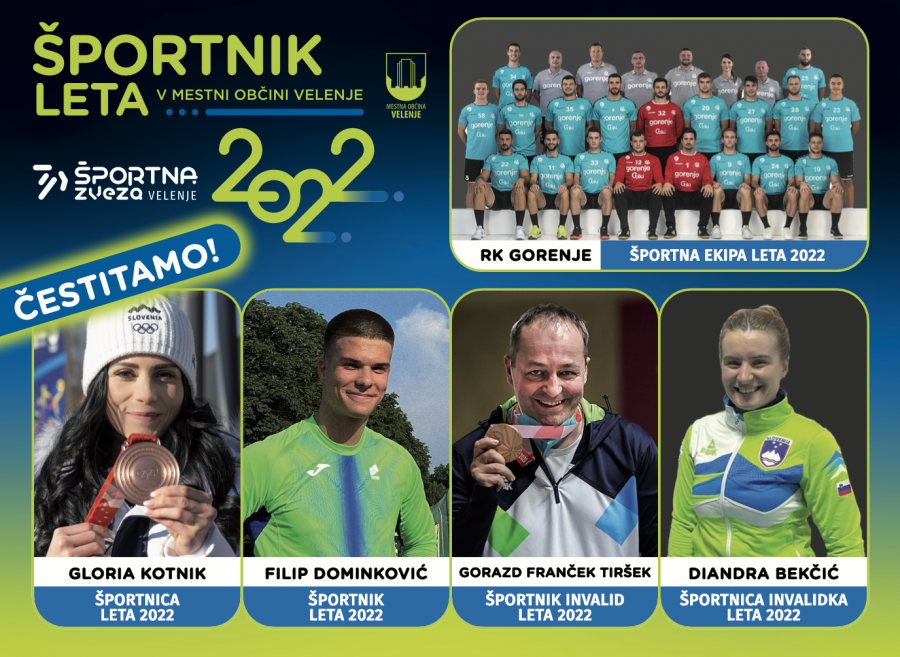Naziv ŠPORTNIK LETA 2022 v članski kategoriji sta osvojila atlet Filip Dominković in deskarka Gloria Kotnik, v kategoriji ekipa leta pa Rokometni klub Gorenje Velenje. Športnik invalid leta je postal strelec Franček Gorazd Tiršek, športnica invalidka leta pa karateistka Diandra Bekčić. Naslov športnika leta 2022 v neolimpijskih disciplinah je pripadel Luki Krelu, najboljša športnica v neolimpijskih disciplinah pa je postala Staša Lipnik, oba prihajata iz TKD&KB kluba Skala Velenje.