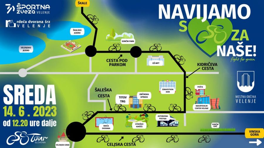 V sredo, 14. junija, bo Velenje del kolesarske dirke Po Sloveniji. Kolesarji se bodo v Velenje pripeljali iz smeri Šoštanja, mimo Gaberk, čez Škale, ob Škalskem jezeru do Starega kina. Trasa se nadaljuje mimo Sončnega parka, po Kidričevi in Šaleški cesti do krožišča pod skakalnico. Nato kolesarijo po Celjski cesti in čez vinskogorski klanec do Črnove oz. odcepa za Dobrno, kjer bodo nadaljevali mimo Dobrne proti Zrečam.