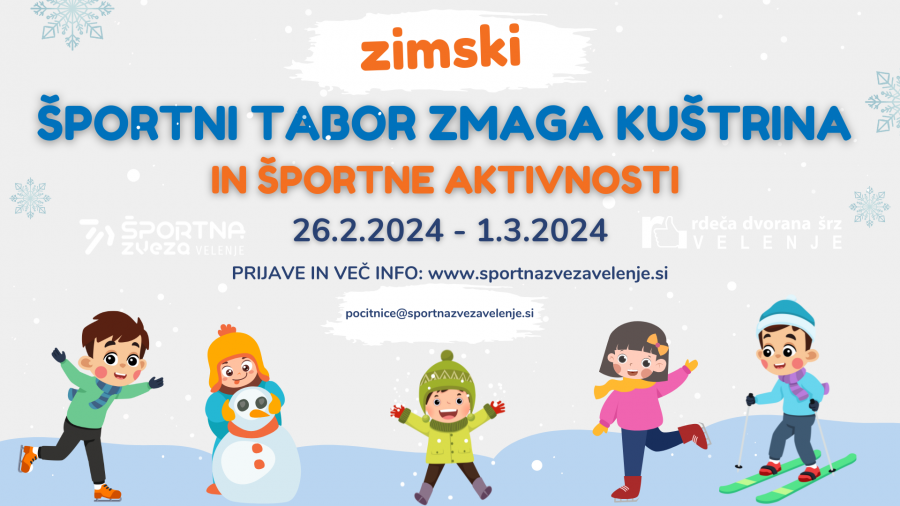 Zimski športni tabor Zmaga Kuštrina bo potekal med zimskimi počitnicami, od 26.2. do 1.3. Vsak dan od 9.00 do 16.00 bodo otroci v rokah izkušenih vaditeljev in učiteljev. Počitniške dneve jim bomo popestrili s športi: namizni tenis, streljanje, judo, gimnastika, otroška atletika, plavanje, badminton, odbojka, nogomet, rokomet, poligoni, šafetne igre,hokej… kot vsako leto je namen tabora zabava, da otroci aktivno preživijo svoj prosti čas ob športnih igrah in druženju z novimi prijatelji.