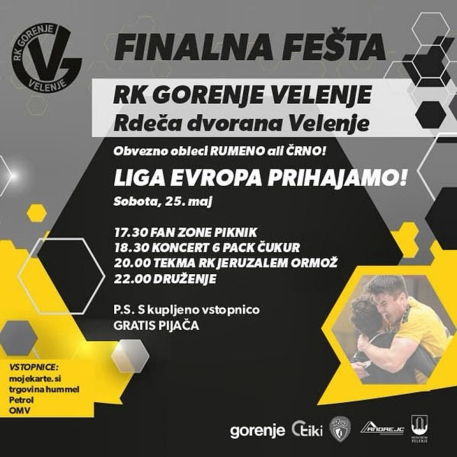 Ob zaključku sezone pa v črno-rumenem taboru pripravljajo finalno fešto, ki se bo začela ob 17.30 uri s Fan zono pred Rdečo dvorano. Pred tekmo bo vse obiskovalce pred Rdečo dvorano zabaval Radio Fantasy, že ob 18.30 pa bo s koncertom postregel Velenjčan 6pack Čukur. Glavno dejanje večera bo tekma med RK Gorenje Velenje in RK Jeruzalem Ormož, ki bo na sporedu ob 20.00 uri!