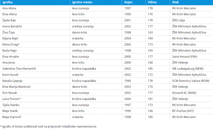 Prvi vpoklic na reprezentančne priprave si je z dobrimi predstavami prislužila levokrilna rokometašica Ana Jeras, ena ključnih posameznic velenjske ekipe. Znova pa sta vabilo prejeli tudi Ema Marija Marković in Lana Puncer. Slednja se bo sicer udeležila tudi aktivnosti mladinske reprezentance, ki bo reprezentančni teden izkoristila za dve pripravljalni tekmi s članskima ekipama klubov slovenske lige.