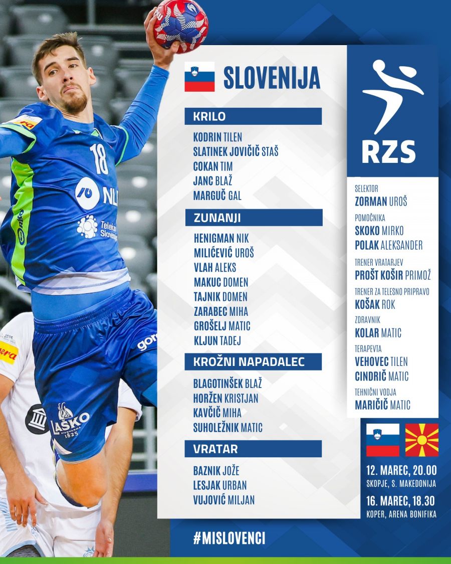 Prvi dvoboj s Severnimi Makedonci bo na sporedu v sredo, 12. marca, v Skopju, povraten sledi v nedeljo, 16. marca, v dvorani Bonifika v Kopru.