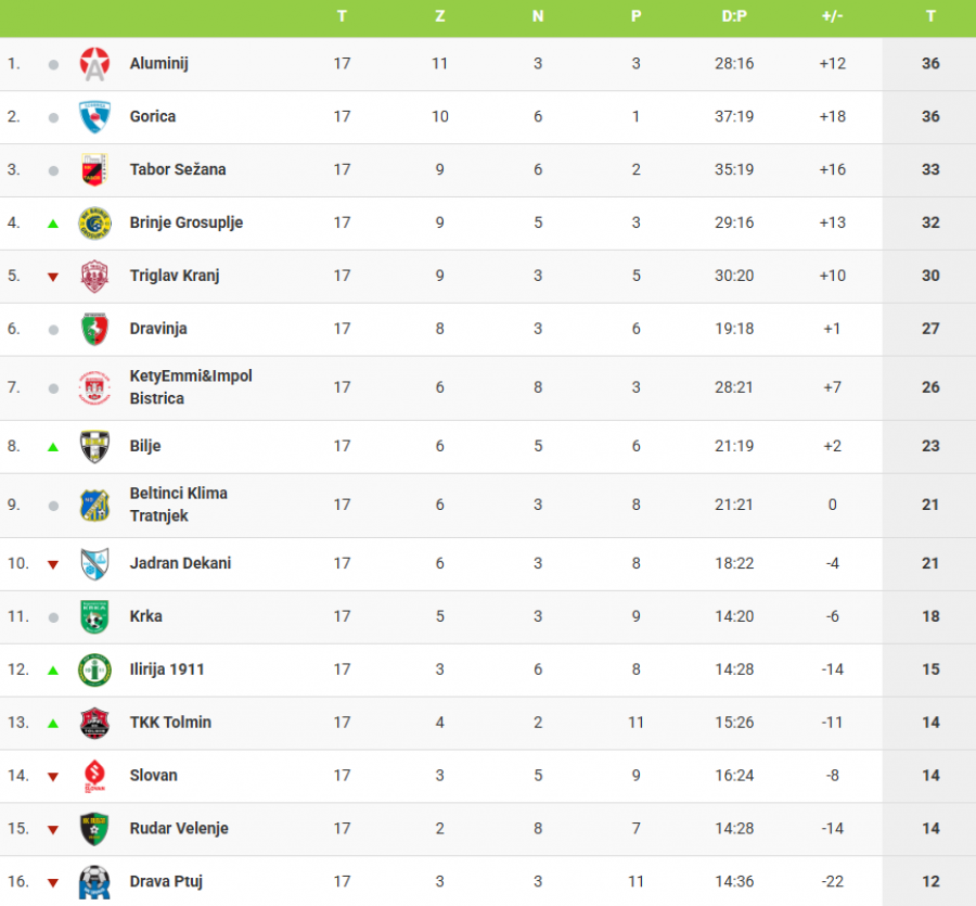 Aluminij in Gorica, ki sta prezimila na vrhu razpredelnice, sta zabeležila zmagi in ostala na vodilnem položaju, v cono izpada pa je znova padel Rudar, ki je v Beltincih vknjižil točko.