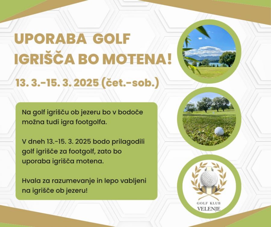 V dneh 13.-15. 3. 2025 bodo prilagodili golf igrišče ob jezeru za footgolf, zato bo uporaba golf igrišča občasno motena.