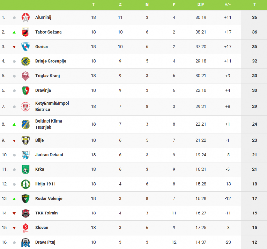 Vodilni ekipi v 2. slovenski nogometni ligi iz Nove Gorice in Kidričevega sta si v 18. krogu privoščili spodrsljaj, kar je izkoristila zasedba iz Sežane in ju ujela na vrhu razpredelnice. Tabor je na domači zelenici ugnal Aluminij (3:2), medtem ko je Gorica v Slovenski Bistrici izgubila z 0:1. Vse tri ekipe imajo po 36 točk.