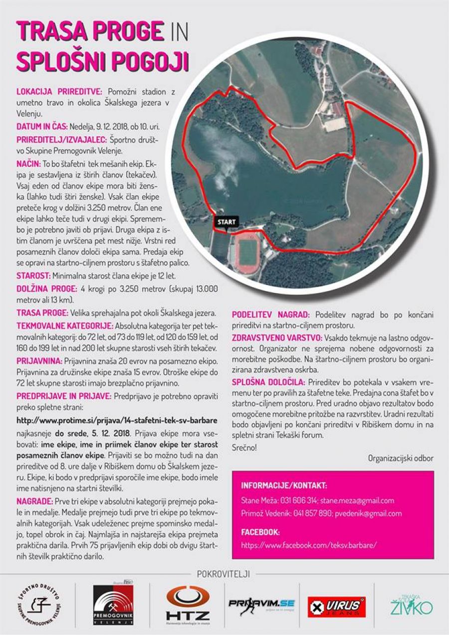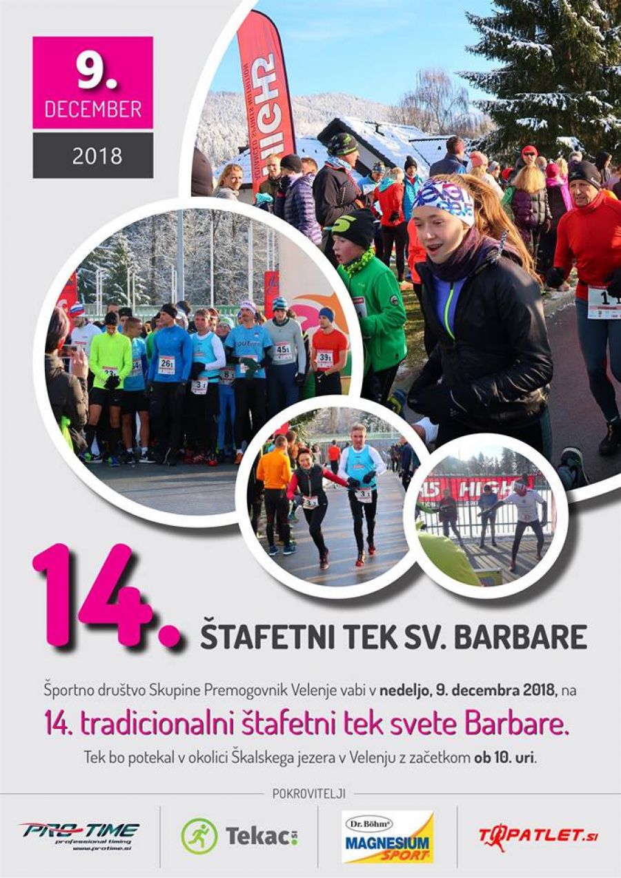 ŠD skupine Premogovnik Velenje, vabi na 14. štafetni tek Sv. Barbare, ki bo potekal v soboto, 09.12.2018, v okolici Škalskega jezera v Velenju z začetkom ob 10.00 uri.
