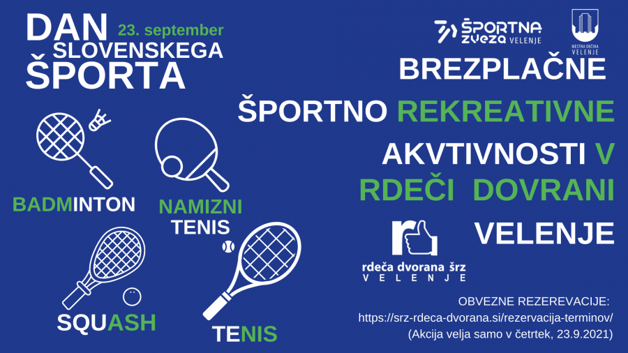 Na praznik športa je tudi Rdeča dvorana ŠRZ Velenje pripravila akcijo za vse rekreativce in sicer bo 23. septembra možen brezplačen najem igrišč za igro tenisa, badmintona, namiznega tenisa in squasha.