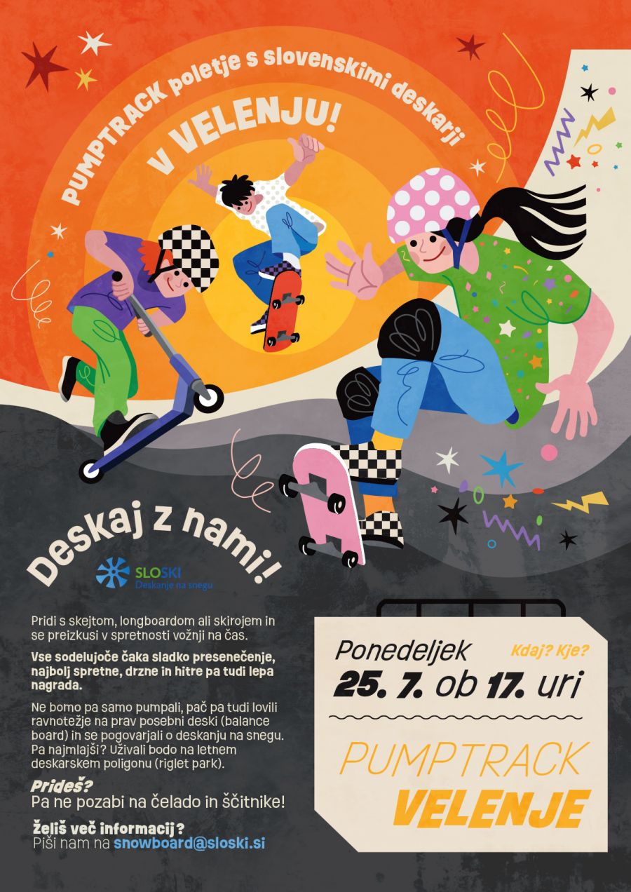 Pridi s skejtom, longboardom ali skirojem in se preizkusi v spretnostni vožnji na čas. Vse sodelujoče čaka sladko presenečenje, najbolj spretne, drzne in hitre pa tudi lepa nagrada.