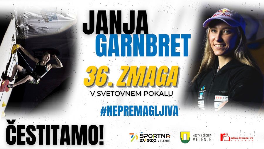Slovenska plezalka in članica velenjskega kluba, Janja Garnbret je zmagala tudi na tekmi svetovnega pokala v težavnosti v Brianconu in podaljšala svojo serijo nepremagljivosti. V finalu je dosegla višino 42+ in za oprimek ugnala Korejko Seo Chaehyun.