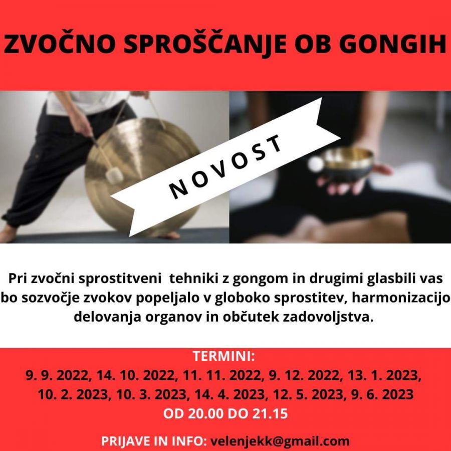Karate klub Velenje vabi na ZVOČNO SPROŠČANJE OB GONGIH: Pri zvočni sprostitveni tehniki z gongom in drugimi glasbili vas bo sozvočje zvokov popeljalo v globoko sprostitev, harmonizacijo delovanja organov in občutek zadovoljstva.
