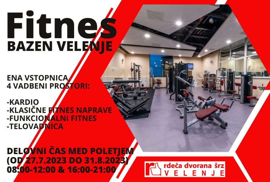 Rdeča dvorana ŠRZ obvešča vse uporabnike fitnesa na Bazenu Velenje, da bo poletni delovni čas fitnesa od 27.7.2023 do 31.8.2023 med 8:00 - 12:00 in 16:00 - 21:00 uro.