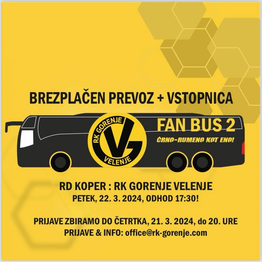 RK Gorenje je za svoje navijače odprl prijave še za drugi FAN BUS. Pohiti s prijavo in jih podpri na pomembno tekmi proti Rokometnemu društvu Koper. Odhod na tekmo bo v petek, 22.3.2024 ob 17.30 uri.