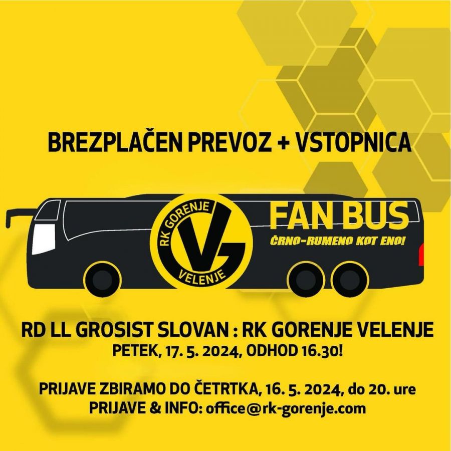 V želji, da na težki tekmi proti RD LL Grosist Slovan v čim večjem številu podprete rokometaše Gorenja Velenja, so za vas pripravili posebno ponudbo. Odločili so se, da bodo vsem zainteresiranim za ogled tekme, plačali prevoz do Ljubljane in nazaj ter vstopnico za ogled tekme 25. kroga Lige NLB.