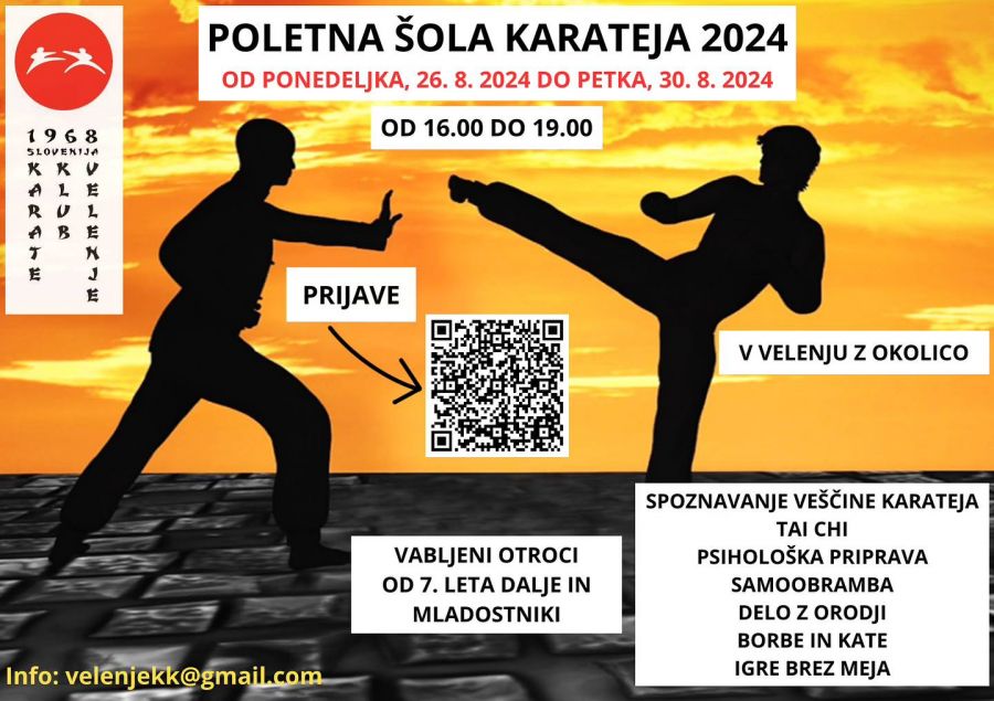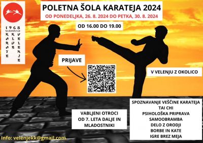 Karate klub Velenje vabi vse otroke od 7. leta dalje in mladostnike, da se jim pridružijo v Poletni šoli karateja, ki bo potekala od ponedeljka 26.8.2024 do petka 30.8.2024.