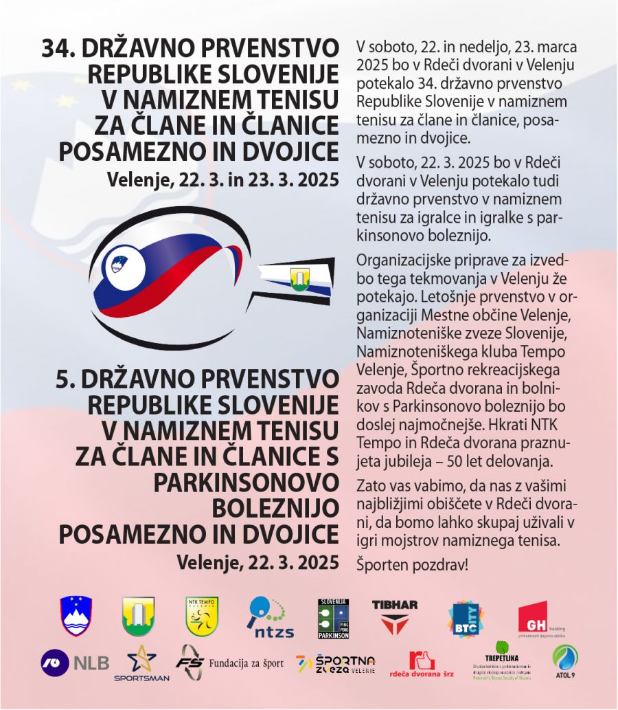 V soboto in nedeljo 22. in 23 marca bo NAMIZNOTENIŠKI KLUB TEMPO v okviru praznovanj 50-letnega delovanja kluba organizira 34. Državno prvenstvo za članica in člane - prijave še potekajo ter 5. Državno prvenstvo za bolnike s parkinsonovo boleznijo - omenili bi, da je med nastopajočimi že prijavljen tudi svetovni prvak Marjan Vitanc iz Gomilskega.