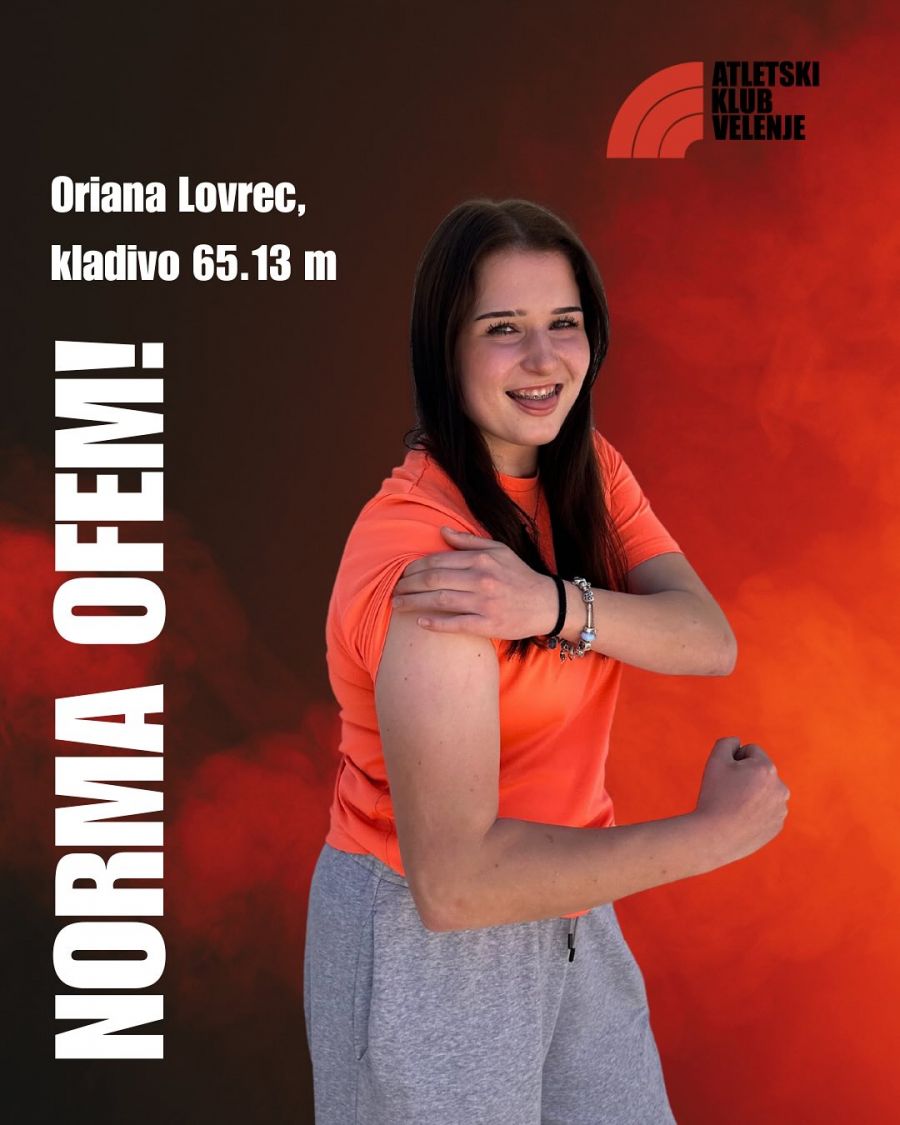 To pa je uspelo tudi velenjski atletinji, metalki Oriani Lovrec. V nedeljo (11. 5. 2025) je na Atletskem pokalu Slovenije za ml. mladince in mladinke v metu kladiva z rezultatom 65.13 m prepričljivo zmagala, popravila svoj osebni rekord in postavila normo za OFEM. Oriana je poleg absolutne prevlade v metu kladiva osvojila tudi 1.mesto v suvanju krogle (13.43 m) in 2.mesto v metu diska (44.26 m).