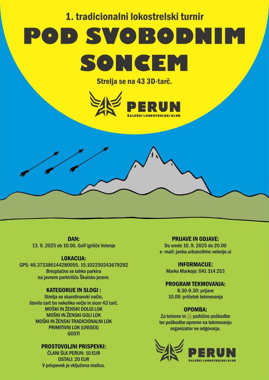 Šaleški lokostrelski klub Perun vabi na 1. tradicionalni lokostrelski turnir POD SVOBODNIM SONCEM, ki bo potekal v soboto, 13. septembra 2025 ob 10. uri na golf igrišču Velenje. Tekmovalci bodo streljali na kar 43 3D-tarč po skandinavskem načinu.
