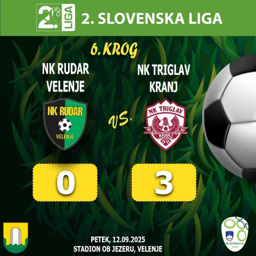 Po Bistrici (3:1), Nafti (1:0), Biljam (2:1) in Brinju (4:2) so Velenjčane včeraj ugnali še nogometaši Triglava (3:0). Knapi so se v zaostanku znašli sredi prvega polčasa, ko je za goste zadil Marin Magdić. V izdihljajih prvega dela srečanja je vodstvo Kranjčanov podvojil Kristian Dakič, dvoboj pa je bil dokončno odločen v 77. minuti, ko je bil z bele točke uspešen še Jakob Cukjati. Triglav ima zdaj na svojem računu 12 točk, Rudar ostaja pri eni sami, ki jo je iztržil v četrtem krogu proti Beltincem (2:2).