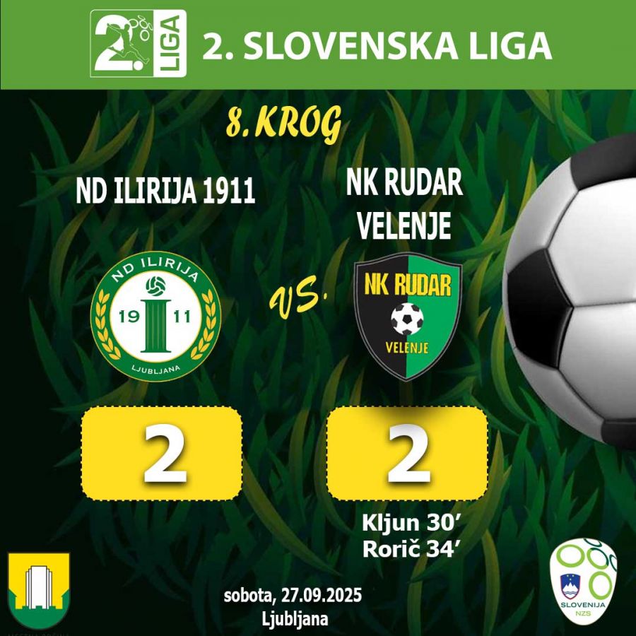 Za vodstvo Velenjčanov je po pol ure igre zadel Tom Kljun, le nekaj minut kasneje pa je mrežo Ljubljančanov zatresel še Maj Rorič. V uvodnih minutah drugega polčasa je zaostanek Ilirije znižal Črt Rotar, ki je štiri minute pred koncem zadel še za dokončno delitev točk (2:2). Knapi so se iz Ljubljane tako vrnili s točko – skupaj jih imajo po petih porazih, dveh remijih in zgolj eni zmagi na računu pet.