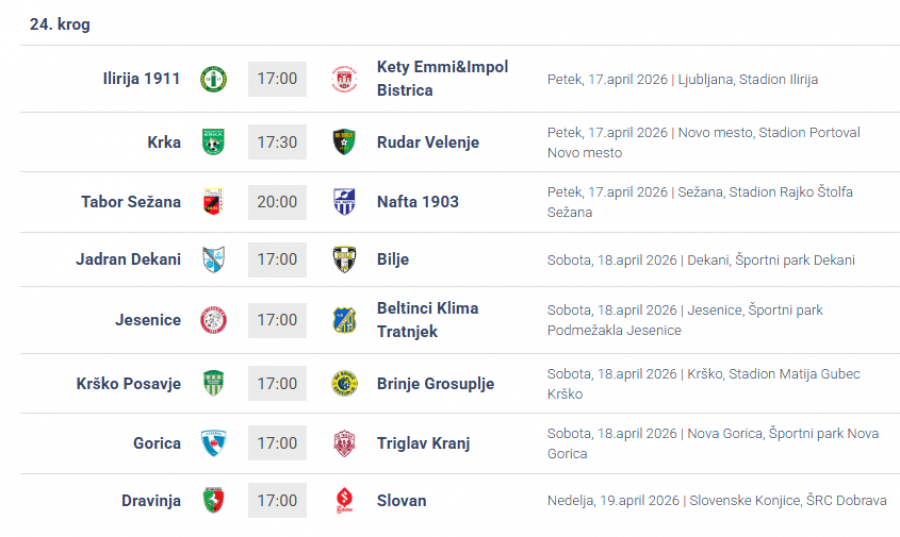 Štiriindvajseti krog se danes nadaljuje z obračuni Dekani - Bilje, Jesenice - Beltinci, Krško - Brinje - Gorica - Triglav, v nedeljo pa bosta moči merila še Dravinja in Slovan.